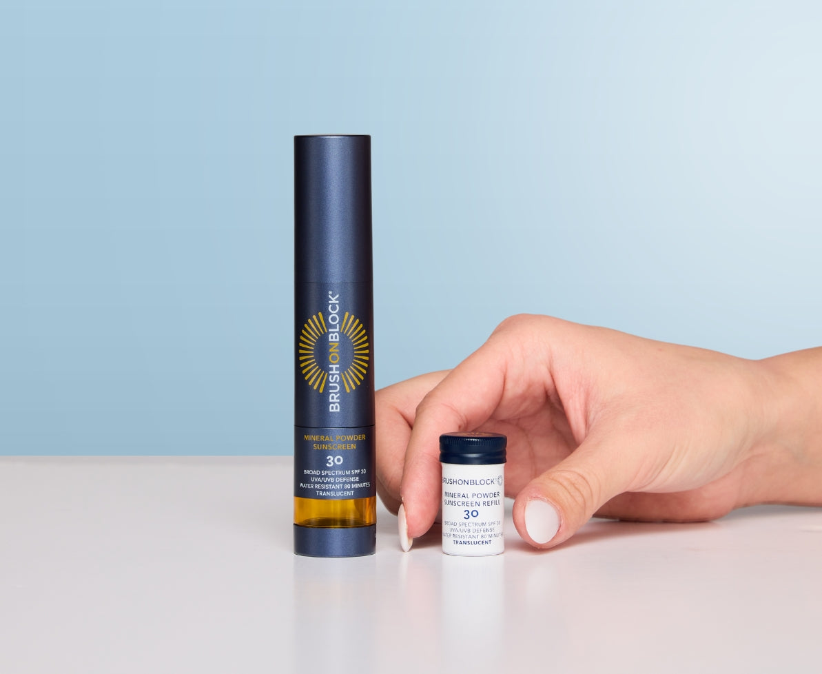 The Brush On Block® SPF 30 Brush + Refill Set gives you everything you need for continuous, on-the-go sun protection. You’ll receive one full-size self-dispensing brush, pre-filled with our SPF 30 mineral powder sunscreen, plus one plastic-free refill pod to use when your brush runs out.