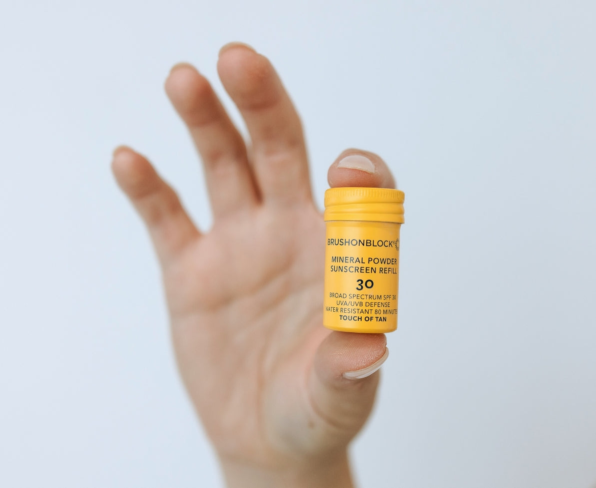 The Brush On Block® SPF 30 Touch of Tan Brush + Refill Set delivers natural-looking coverage and reliable sun protection in one smart bundle. You’ll get a full-size self-dispensing brush pre-filled with our tinted mineral powder sunscreen, plus a plastic-free refill pod for when your brush runs out.